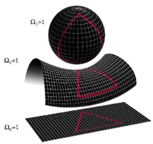 A cosmologia do Big Bang é baseada na teoria da relatividade geral e no princípio cosmológico que supõe que a matéria no universo é distribuida de forma homogênea e isotrópica em grandes escalas. Esta cosmologia calcula a dinâmica do próprio espaço-tempo a medida que o universo evolve. Este procedimento nos permite calcular as curvaturas do universo como sendo: (a) Fechadas, (b) Planas, e (c) Abertas. A distorção correspondente do espaço-tempo só pode ter uma destas três formas, como mostrado esquematicamente na figura ao lado: (i) “Positivamente” curva como a superfície de uma bola e finita em extensão; (b) “Plana” e infinita em extensão nossa concepção “comum” de espaço-tempo – e (c) “negativamente” curvada como uma sela e infinito em extensão. Mas note que na imagem mostrada aqui, nós só podemos retratar a curvatura de um plano bidimensional de um espaço tridimensional real. Em um universo fechado, se poderia iniciar uma jornada em uma direção e, com tempo suficiente, se retornar ao ponto de partida; em um universo infinito, nunca se poderia retornar ao ponto de partida.