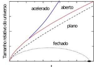A figura ao lado mostra um gráfico descrevendo o tamanho relativo do universo durante os seus bilhões de anos sob diferentes cenários de como o espaço e a matéria nele evoluem com o tempo. Os detalhes dependem da densidade e de sua pressão. Mas o quadro genérico que emerge é que o universo começou de um volume muito pequeno com uma taxa de expansão inicial. Essa taxa de expansão tem diminuído (desacelerando) desde então, devido à força gravitacional da matéria sobre si mesma. Mas não sabemos exatamente se a força da gravidade é forte o suficiente para reverter a expansão e fazer o universo colapsar sobre si mesmo (linha pontilhada). De fato, observações recentes levantaram a possibilidade de que a expansão do universo poderia de fato estar se acelerando, levantando a possibilidade de que a evolução do universo ser dominada por uma forma bizarra de matéria que tem uma pressão negativa.