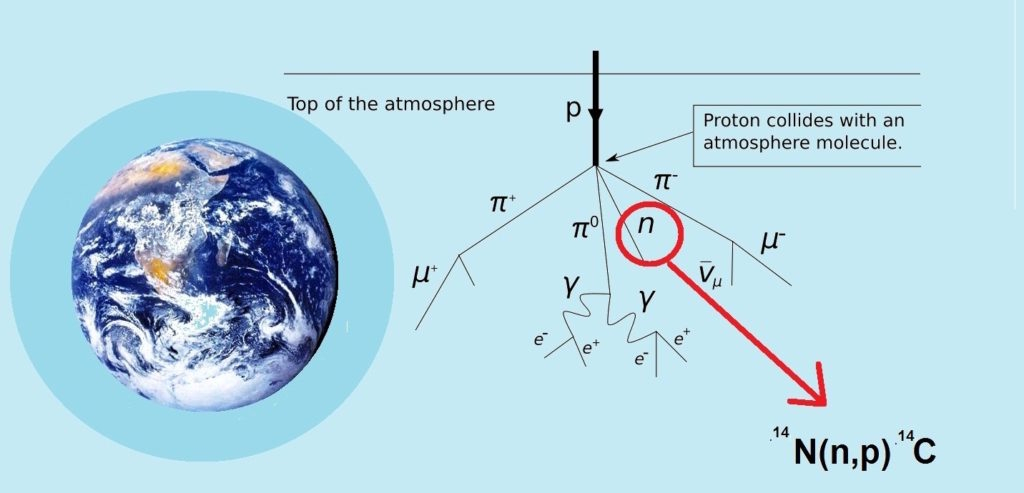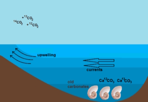 O carbono 14 é produzido na atmosfera terrestre e entra no oceano de forma lenta. O ambiente marinho possui também muitos carbonatos fósseis, cujo carbono 14 já decaiu, restando apenas os isótopos estáveis.